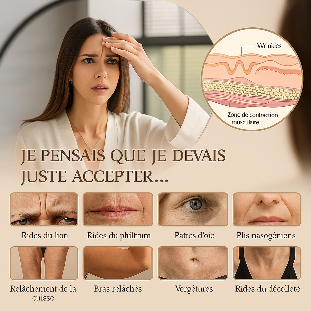 " Les joues moins fermes, les plis autour de la bouche, et ces rides du front qui se creusaient de jour en jour. J’avais même envisagé les injections… mais j’avais peur de ce rendu figé, non naturel, que tout le monde remarque.