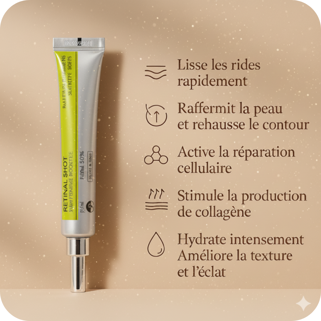 💡 Grâce aux peptides “effet Botox” et à la technologie Retinol Shot, ce sérum révolutionnaire retend visiblement et lisse la peau — sans aiguilles ni temps de récupération.