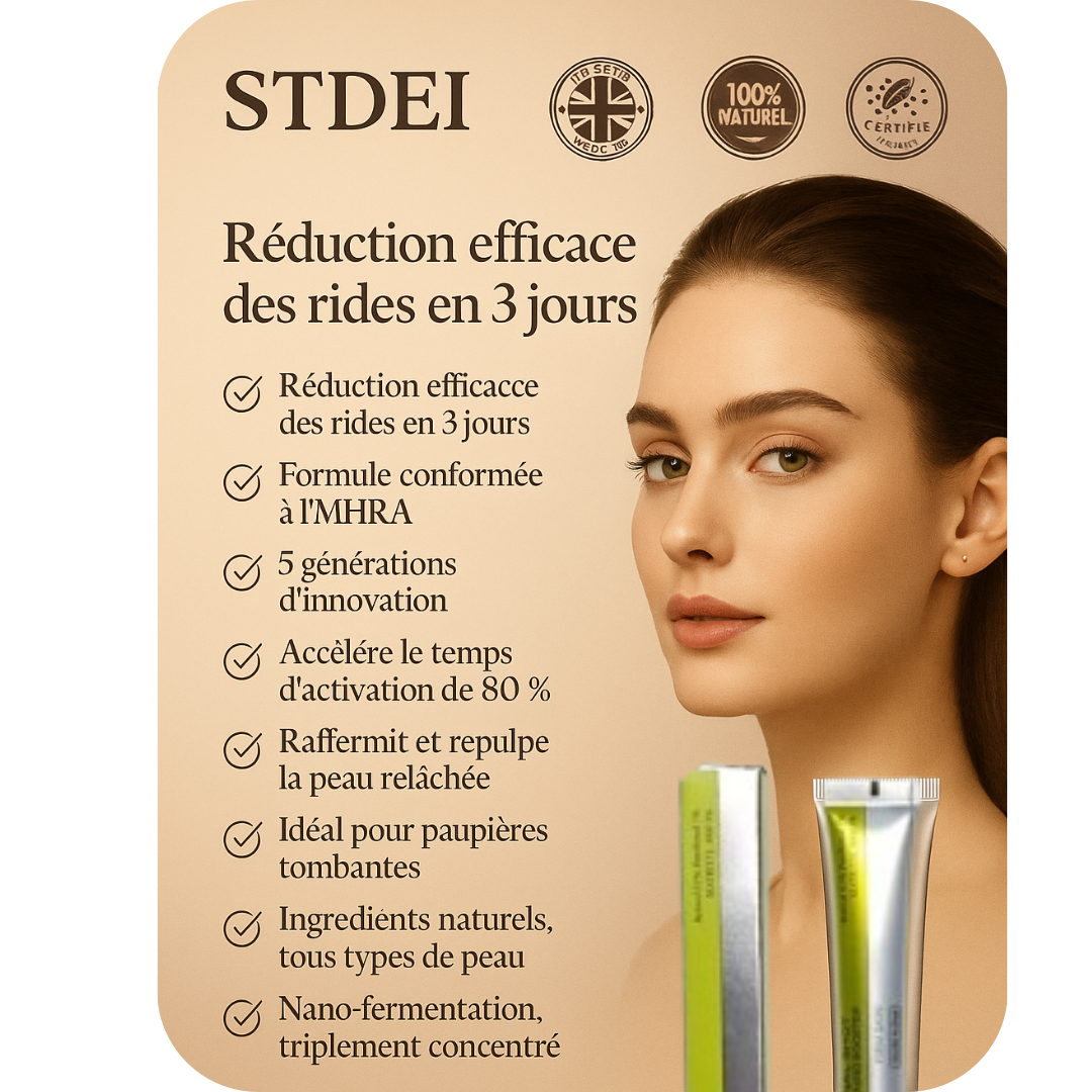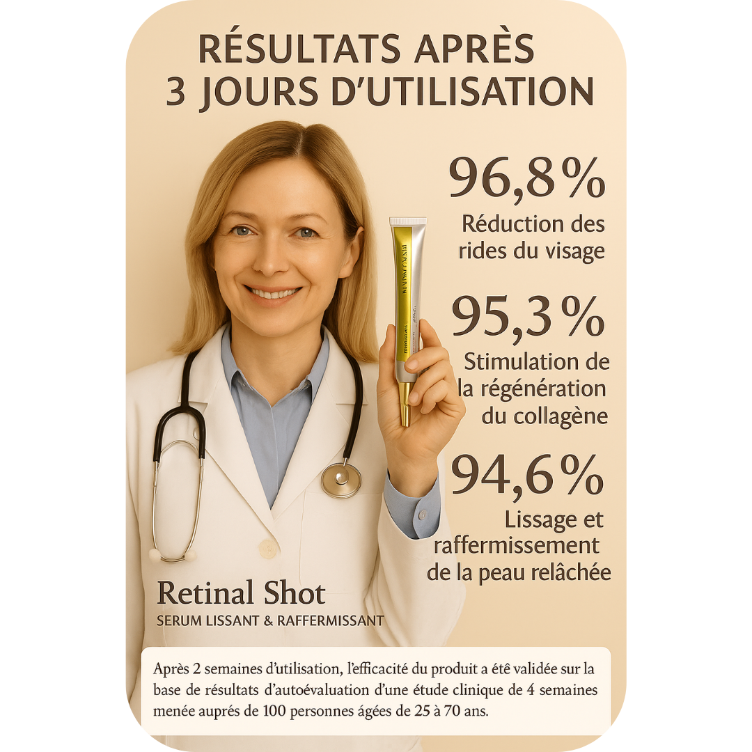 Des études menées sous contrôle dermatologique montrent une réduction visible des rides et une amélioration rapide de la fermeté dès les premiers jours d’utilisation.