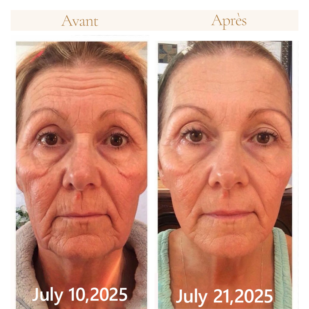 Ce soin a redonné de la lumière à mon visage ! Mon teint est plus clair, plus uniforme et mes rides s’estompent petit à petit. Je me sens plus confiante sans maquillage, ma peau a retrouvé tout son éclat naturel. ⭐⭐⭐⭐⭐
